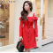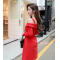 商品名称:粉红大布娃娃2018春季新品时尚中长款收腰露肩翻领一字领连衣裙 大红色 L
