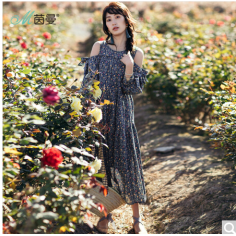 哥弟女装2018春季新款中长裙吊带V领连衣裙、
