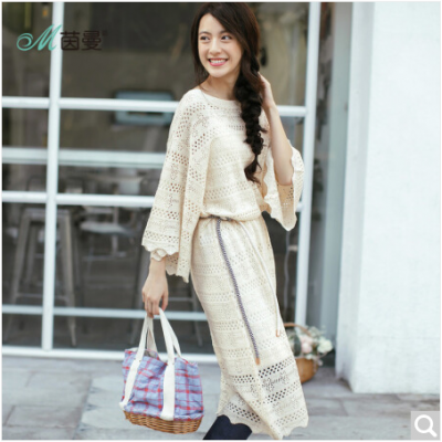 2018春装新款圆领净色宽松镂空针织连衣长裙女