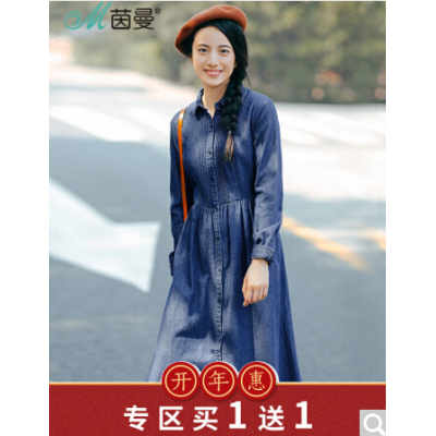 茵曼秋冬翻领风琴褶腰带显瘦A摆牛仔连衣裙女