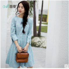 2018春装新款一字领格纹七分袖收腰显瘦连衣裙女